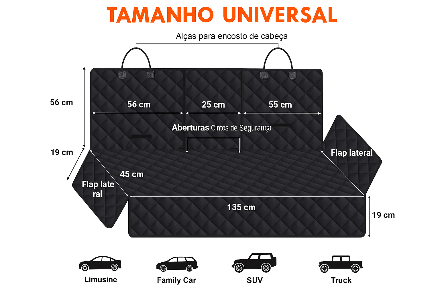 - Tamanho Ideal: Com largura de 135cm, adapta-se perfeitamente à maioria dos bancos traseiros, proporcionando cobertura completa.